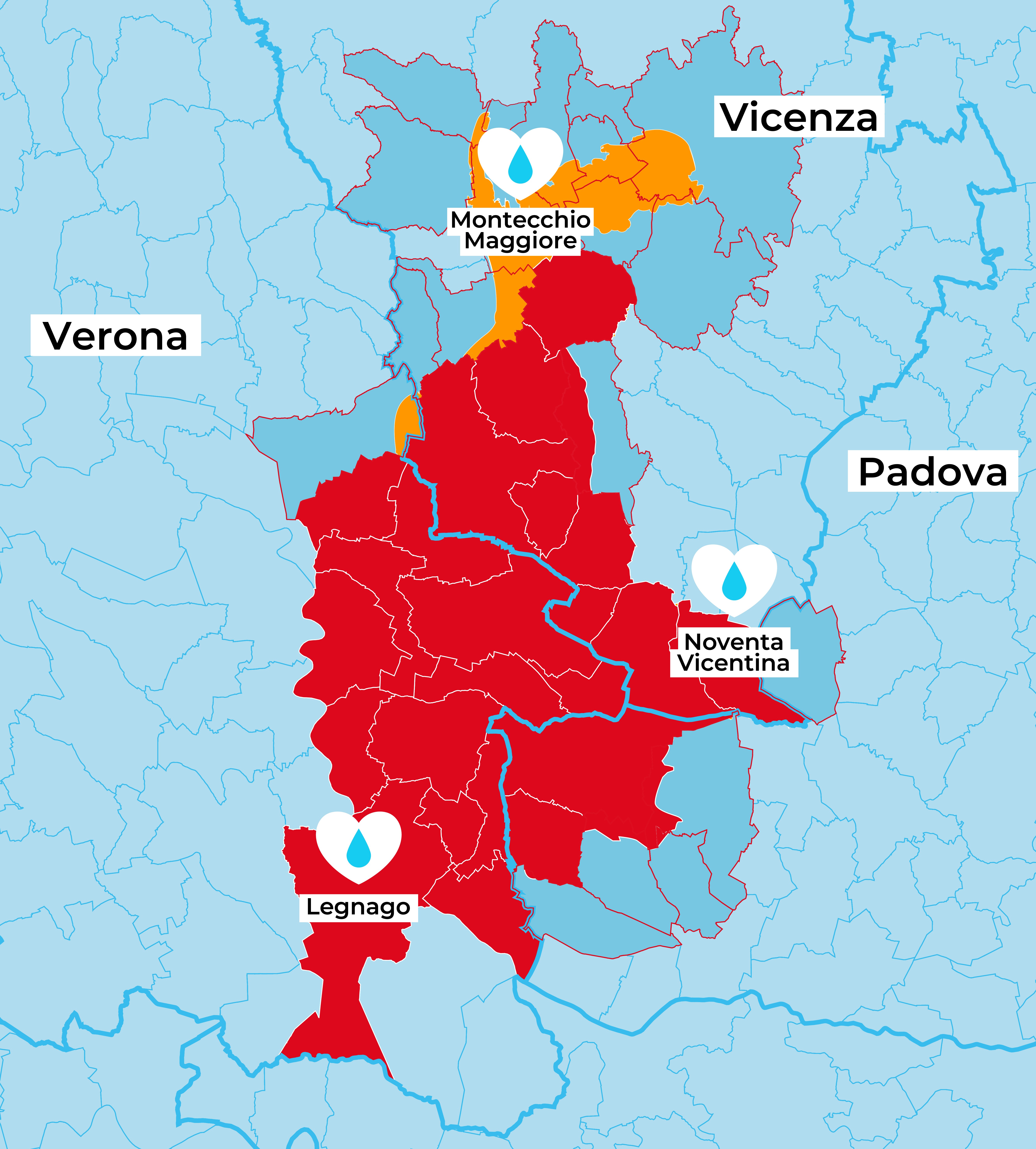 La mappa mostra le aree del Veneto, divise tra le province di Vicenza, Verona e Padova, interessate dalla contaminazione da PFAS nelle acque, suddivise in tre livelli di gravità.